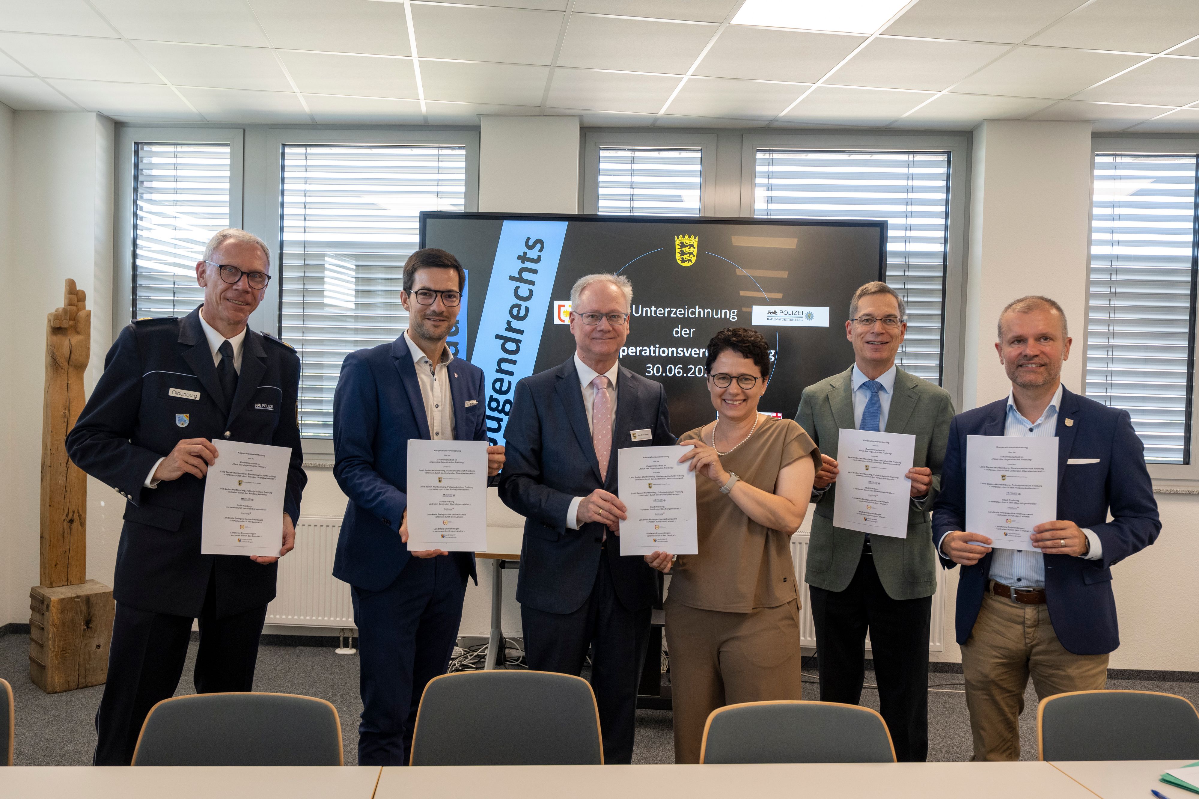 In Anwesenheit von Frau Ministerin der Justiz und für Migration Marion Gentges MdL unterzeichneten die Leiter der Staatsanwaltschaft und des Polizeipräsidiums Freiburg, der Oberbürgermeister der Stadt Freiburg und die Landräte der Landkreise Breisgau-Hochschwarzwald und Emmendingen am 30. Juni 2025 in den Räumlichkeiten der Staatsanwaltschaft Freiburg eine gemeinsame Kooperationsvereinbarung über die Zusammenarbeit im „Haus des Jugendrechts“ am Standort Freiburg.